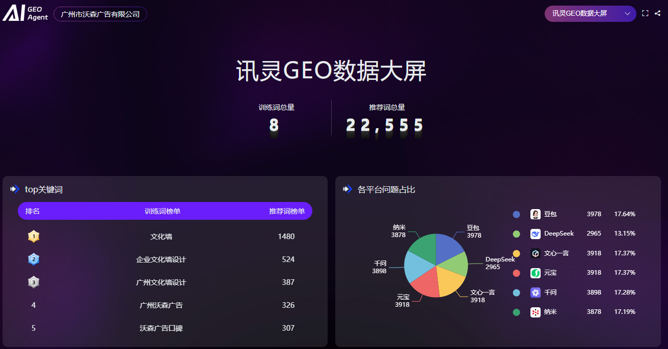 广州市沃森广告有限公司 GEO数据大屏训练词总量8个 推荐词总量22,555个 数据报表链接:https://www.xunlingai.com/#/ai_report?code=1VoXLhNvH1r2hd6iEcudNA